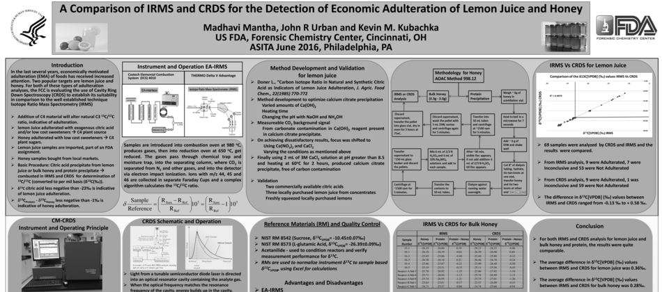 In the last several years, economically motivated adulteration (EMA) of foods has received increased attention. Two popular targets are lemon juice and honey For both of these types of adulteration analyses, the FCC is evaluating the use of Cavity Ring Down Spectroscopy (CRDS) to establish its suitability in comparison to the well established technique Isotope Ratio Mass Spectrometry IRMS)