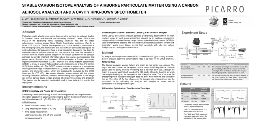 Particulate matter affects more people than any other ambient air pollutant, leading to increased risk of cardiovascular and respiratory diseases. Levels of PM10 and PM2.5 in the developing world, especially southeast Asia and the Indian subcontinent, routinely exceed World Health Organization guidelines, often by a factor of 10 or more. Despite their importance to poor air quality in urban areas in the developing world, the mechanisms that lead to heavy particulate loading are not well understood. Consequently, there is great interest in developing new tools for understanding the pollution sources and mechanisms that drive the formation of harmful aerosols. Stable isotope analysis of the carbon contained in the aerosols promises to provide important information about the sources and processes that govern aerosol formation and transport. We have coupled a Sunset Laboratories organic and elemental carbon (OC/EC) analyzer to a cavity ringdown spectrometer (CRDS) to create a system that provides hourly measurements of the d13C content of PM in the ambient air. The OC/EC system executes a sequence of temperature and oxygenation steps to create distinct CO2 pulses of organic carbon, carbonate carbon, and elemental carbon, which are subsequently analyzed by the CRDS instrument for d13C -CO2. We present laboratory measurements with this system, including calibration, precision, and drift, demonstrating that a system of this design can deliver aerosol stable isotope analysis at sub-permil accuracy and precision. This system can be operated unattended, and is thus suitable for remote field deployment.
