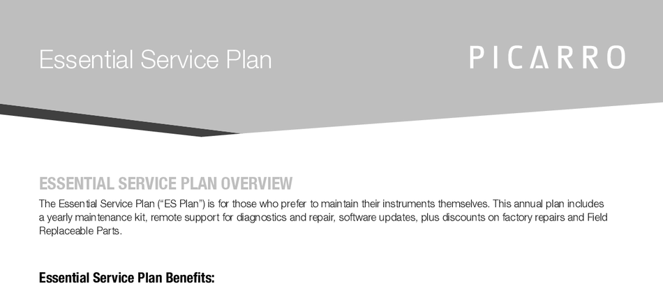 The Essential Plan W3101 is for those who prefer to maintain their instruments themselves. This plan includes a yearly maintenance kit, remote support for diagnostics and repair, software updates, plus discounts on factory repairs and Field Replaceable Parts that the Picarro technical support group determines are necessary to restore the functionality of the instrument and that can be replaced by the customer on-site.