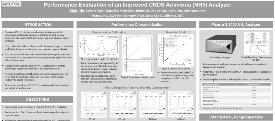 Ammonia (NH3) is the highest abundant alkaline gas in the atmosphere, and it is a major contributor to total reactive nitrogen in the environment and causes long-term climate change problems. NH3 is also a hazardous pollutant with detrimental impacts on human health that demands strict control over personal exposure levels. High-precision quantification of NH3 is demanded for routine monitoring, regulation compliance, and migration needs. Accurate monitoring of NH3 emissions can be challenging at low levels (ppb to ppm) due to the high reactivity of NH3 and its tendency to adsorb to surfaces. In this poster, Picarro shares results of experiments to characterize the performance of the new SI2103 NH3 analyzer, including: