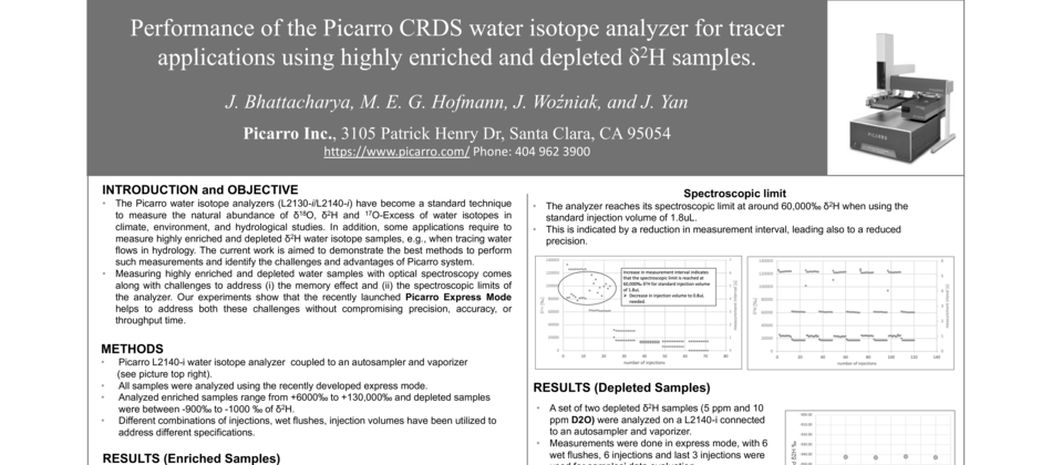 In this poster, Picarro shares research and recommended best practices for using Picarro water isotope analyzers to measure highly enriched and depleted δ2H water isotope samples. These tips will be especially helpful for hydrological tracer studies and kinesiological applications. The experiments show how the Picarro water isotope analyzers’ Express Mode helps to address the memory effect and the spectroscopic limits of the analyzer without compromising precision, accuracy, or throughput time.