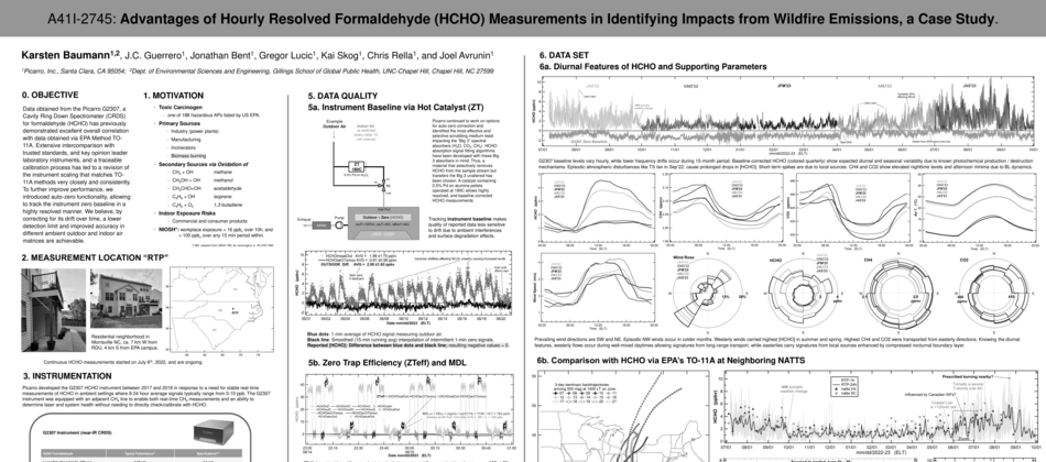 This poster highlights a case study on the impacts of wildfire emissions in Canada on the Carolinas and Virginia. It features some really interesting findings comparing the Picarro G2307’s formaldehyde measurements to those from the EPA National Air Toxics Trends Station (NATTS) Network. It shows that by correcting for drift over time, a lower detection limit and improved accuracy in different ambient outdoor and indoor air matrices are achievable with G2307. Its ability to deliver high-resolution data can provide valuable information about acute exposure risks during potentially harmful periods that are impacted by wildfire or other biomass burning emissions.