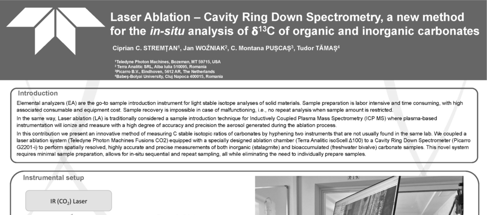 At EGU 2024 in Vienna, Ciprian Stremtan, Jan Woźniak, Montana Puscas and Tudor Tamas presented a poster: Laser Ablation - Cavity Ring Down Spectrometry as a new method for in-situ analysis of δ13C in carbonate samples.