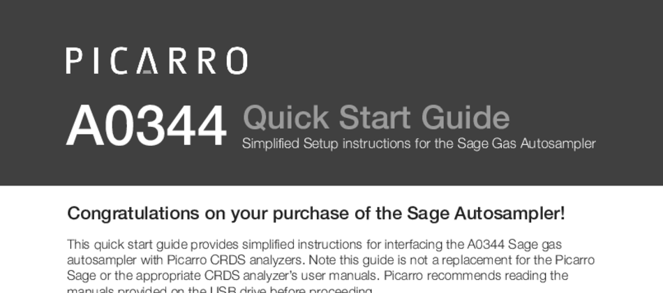 This quick start guide provides simplified instructions for interfacing the A0344 SAGE gas autosampler with Picarro CRDS analyzers. Note this guide is not a replacement for the Picarro Sage or the appropriate CRDS analyzer’s user manuals. 下载
