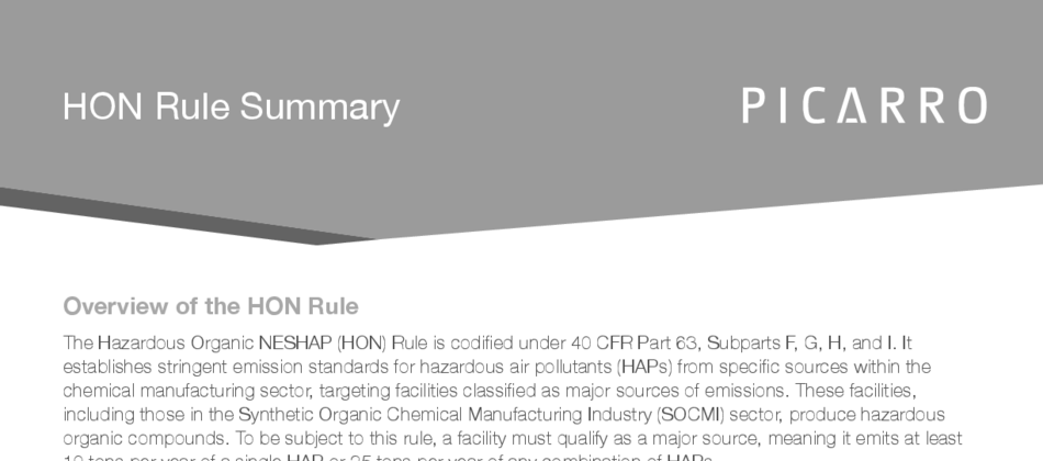 The Hazardous Organic NESHAP (HON) Rule requires chemical manufacturing facilities to implement fenceline monitoring programs to ensure hazardous air pollutants remain below EPA action levels. With compliance deadlines beginning in July 2026, facilities must monitor six regulated hazardous air pollutants (HAPs), respond quickly to exceedances, maintain detailed records, and conduct quarterly reporting. This document outlines the regulatory requirements and explains how real-time monitoring and automated workflows can replace delayed passive methods with faster, more defensible compliance.