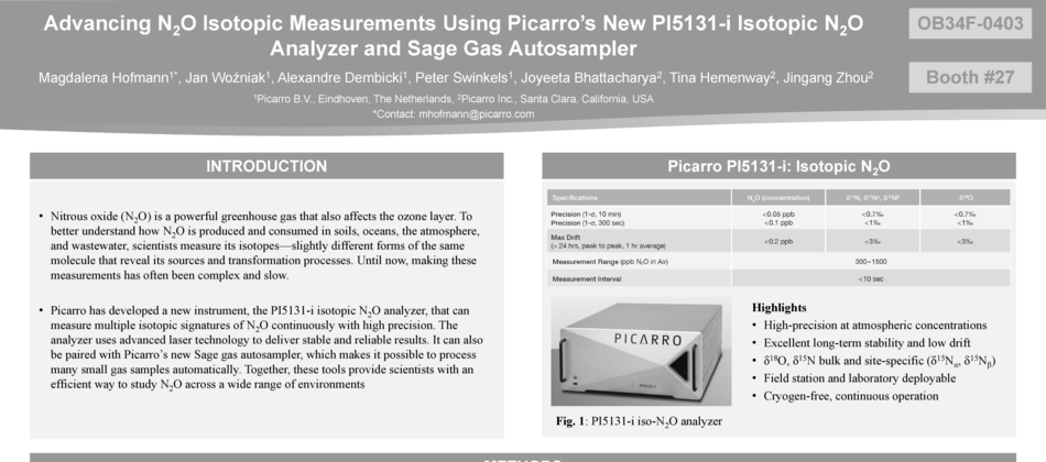 Picarro has developed a new instrument, the PI5131-i isotopic N2O analyzer, that can measure multiple isotopic signatures of N2O continuously with high precision. The analyzer uses advanced laser technology to deliver stable and reliable results. It can also be paired with Picarro’s new Sage gas autosampler, which makes it possible to process many small gas samples automatically. Together, these tools provide scientists with an efficient way to study N2O across a wide range of environments